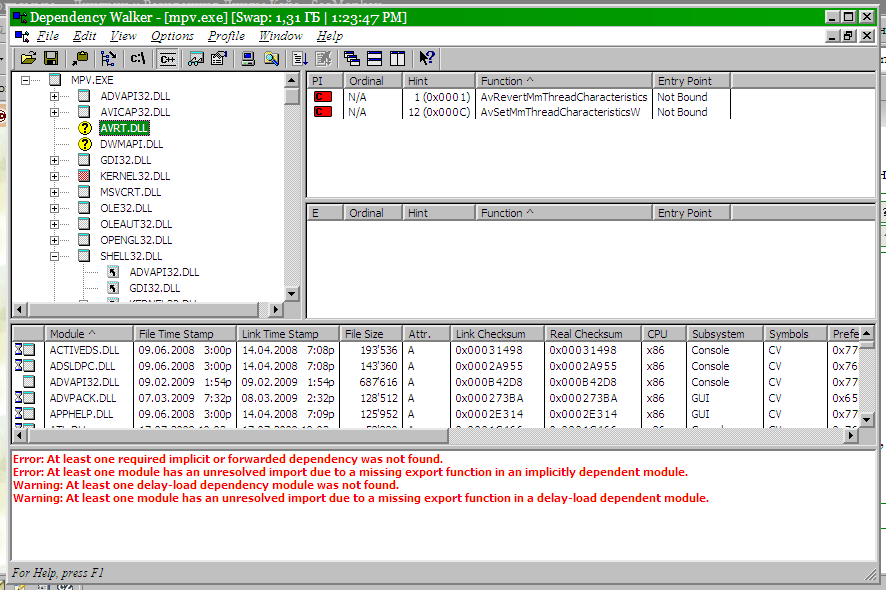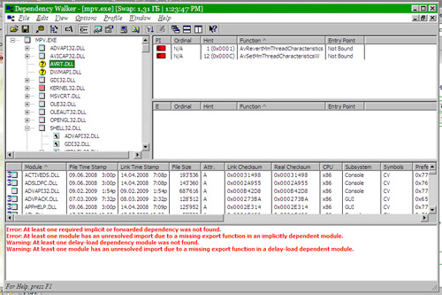 А вот что показывает Dependency Walker в конкретном случае. Не знаю, что там за avrt.dll, но dwmapi.dll – очевидно.